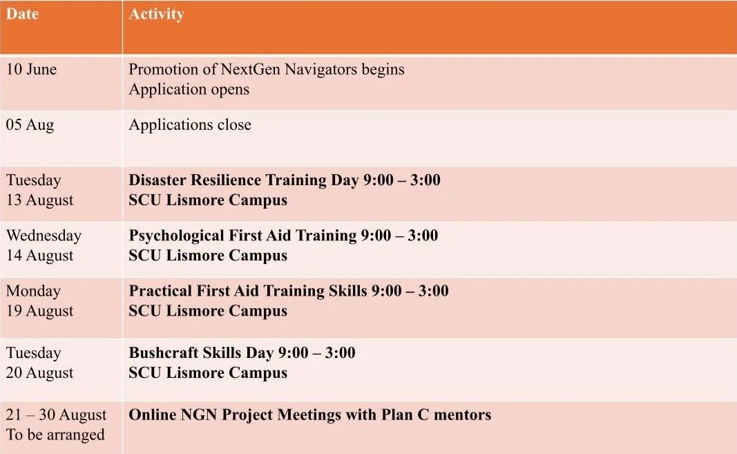 Community Youth Inspired Projects: As part of the NextGen Navigator program you will be supported in designing and implementing a small community building project in your own community. Examples could include volunteering for Plan C in delivering this program, teaching disaster resilience skills to a group of friends, creating an awareness raising video for social media, creating a WhatsApp group among neighbours or continuing to build your own disaster resilience skills by joining an emergency service agency (RFS, SES, etc.).